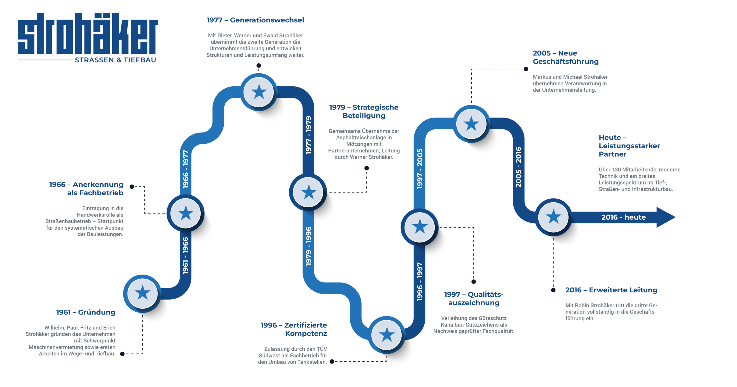 Aus dem gewachsenen Bauunternehmen entwickelte sich schrittweise die Strohäker Group. Neue Geschäftsfelder wie Pave+ im Bereich Maschinentechnik und Asphalt sowie S+ MediaWorks im Bereich Kommunikation und digitale Lösungen erweitern die ursprüngliche Kernkompetenz. Diese Entwicklung ist Ausdruck unternehmerischer Verantwortung und bewusster strategischer Weiterentwicklung.